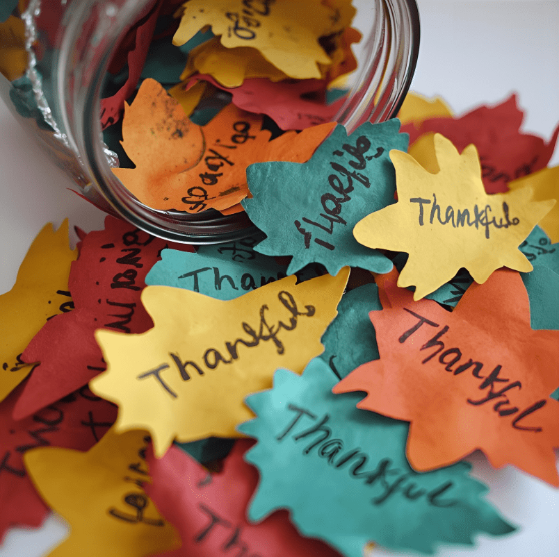One of the simplest yet most powerful ways to bring mindfulness into your family’s fall routine is with a gratitude jar. Start by cutting out leaf shapes from recycled paper — you can use leftover scrap paper, old envelopes, or any paper you have around. Encourage everyone in the family, no matter their age, to write down one thing they’re grateful for each day. It could be something big, like a fun day at the park, or something small, like a warm cup of cocoa on a chilly morning.
