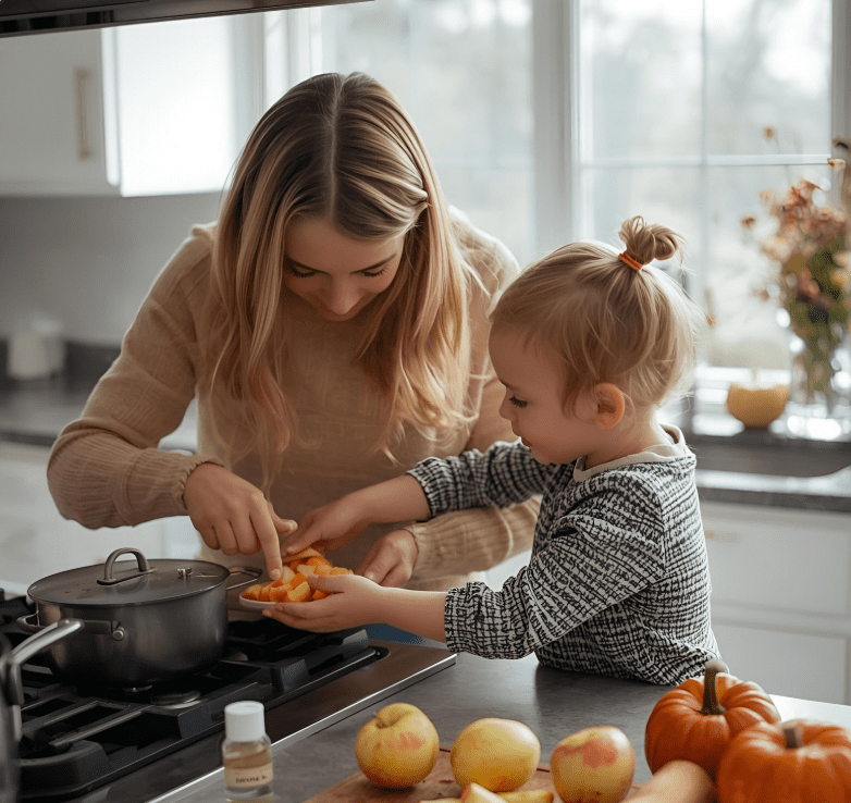 Cooking with your kids is a wonderful way to practice mindfulness and celebrate the flavors of the season. Invite them into the kitchen to peel apples, scoop pumpkin seeds, stir soups, or measure ingredients. Encourage them to notice the colors, textures, and smells as they work — the bright orange of pumpkins, the deep red of apples, or the earthy aroma of cinnamon. These small sensory moments turn everyday cooking into a mindful, joyful experience.